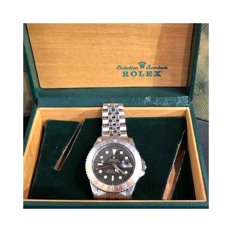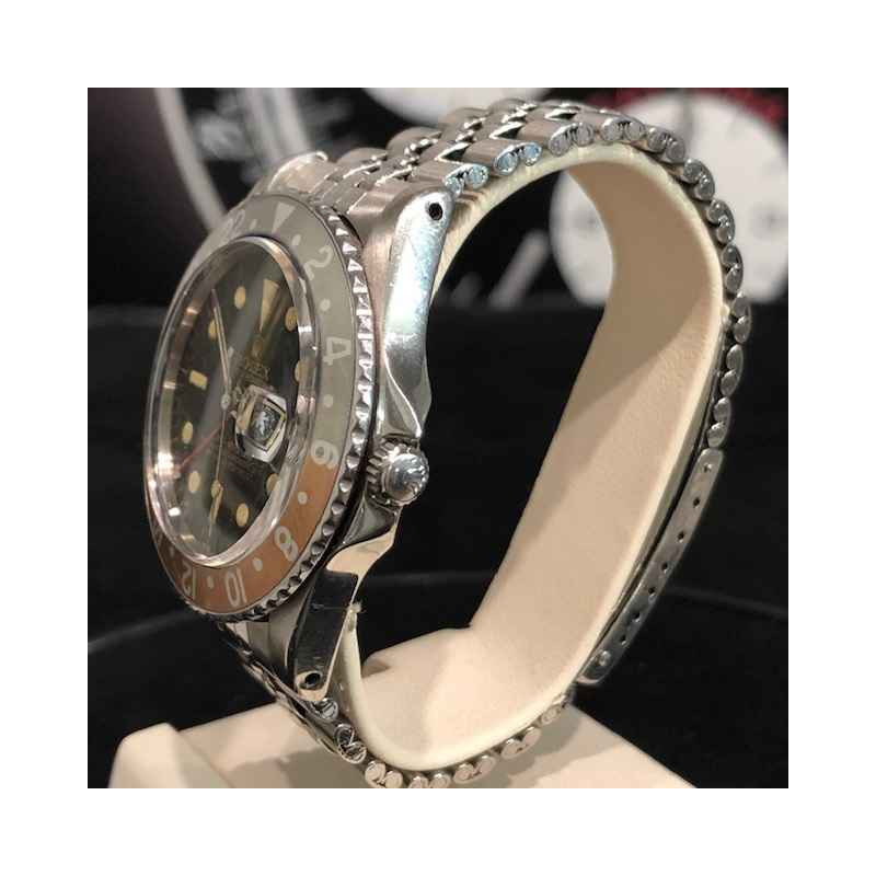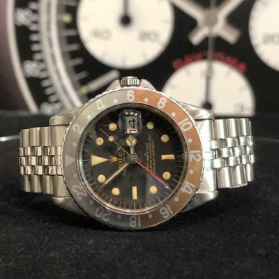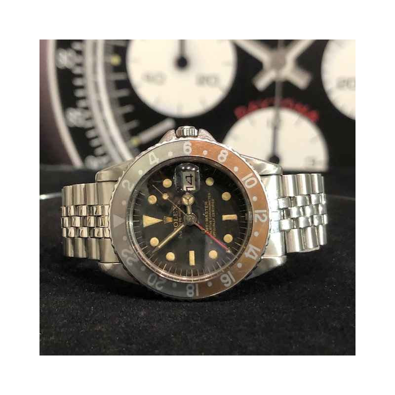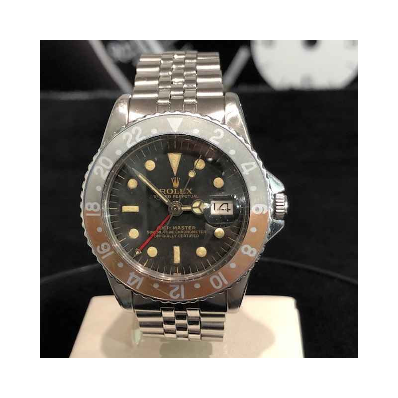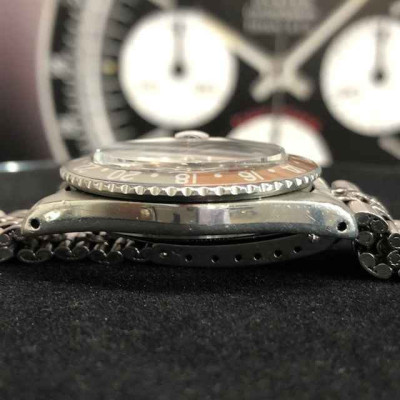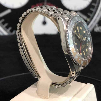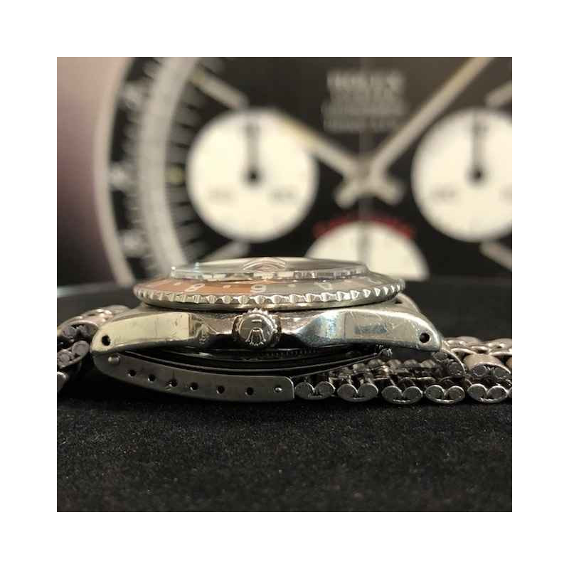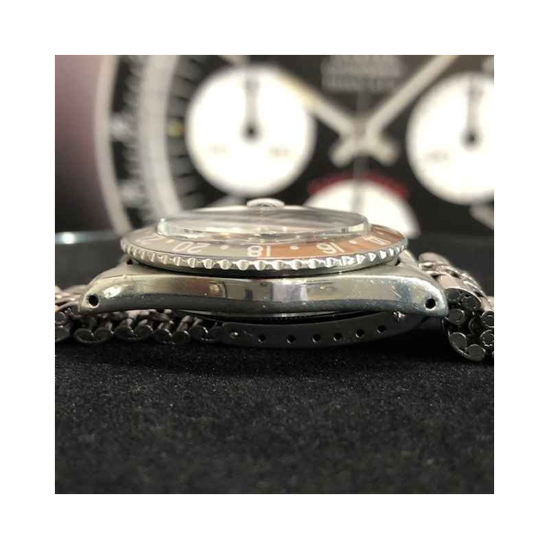 Laurenti Orologi propone uno strepitoso Rolex GMT Master Ref 1675, movimento a carica automatica calibro 1570, cassa in acciaio da 40mm., vetro plastica, quadrante nero con grafica oro radiale tropical con scritta Swiss, ghiera con inserto originale di colore rosso brunastro / blue sbiadito, bracciale jubile seriale 6251 H in acciaio originale Rolex.