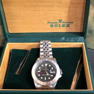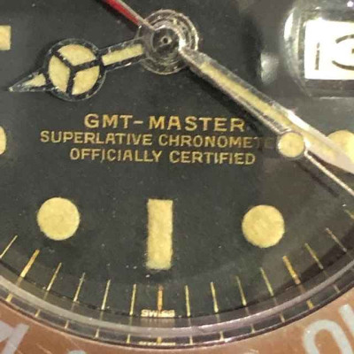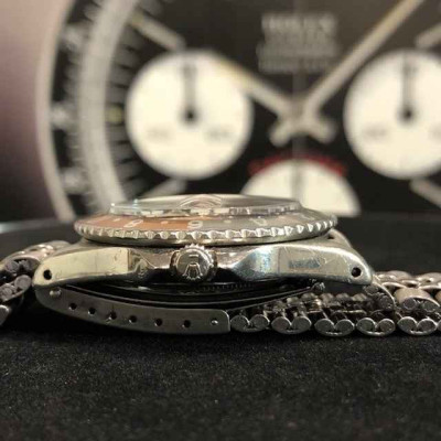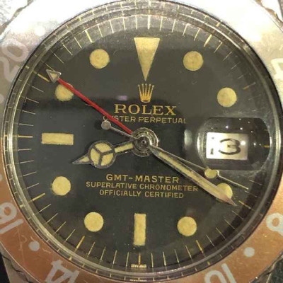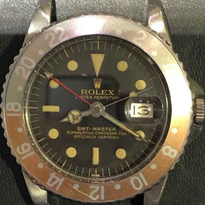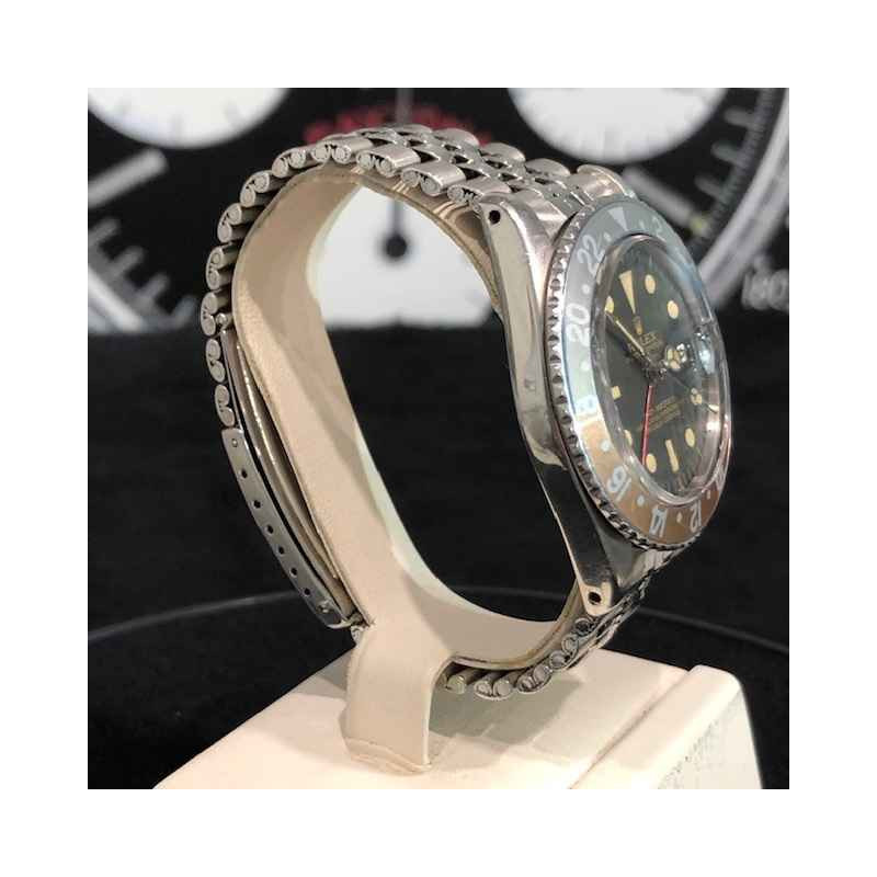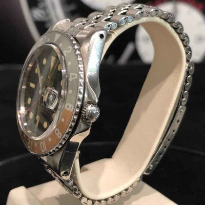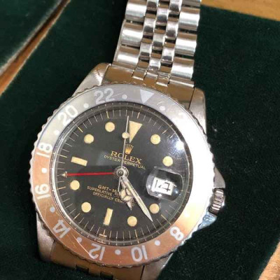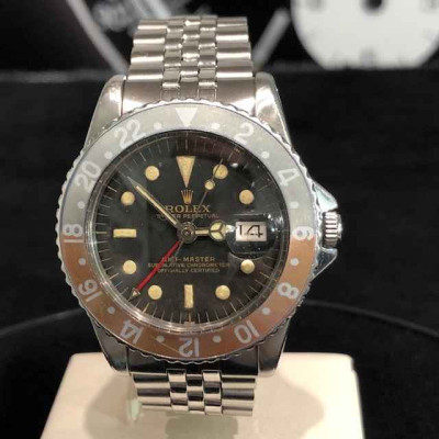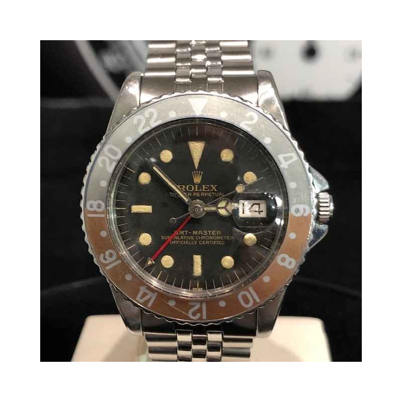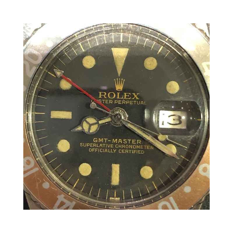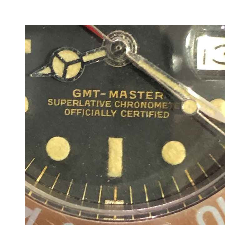 Laurenti Orologi propone uno strepitoso Rolex GMT Master Ref 1675, movimento a carica automatica calibro 1570, cassa in acciaio da 40mm., vetro plastica, quadrante nero con grafica oro radiale tropical con scritta Swiss, ghiera con inserto originale di colore rosso brunastro / blue sbiadito, bracciale jubile seriale 6251 H in acciaio originale Rolex.