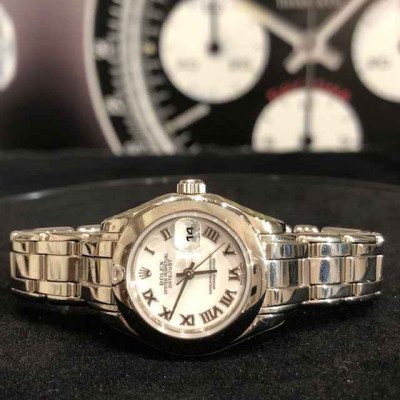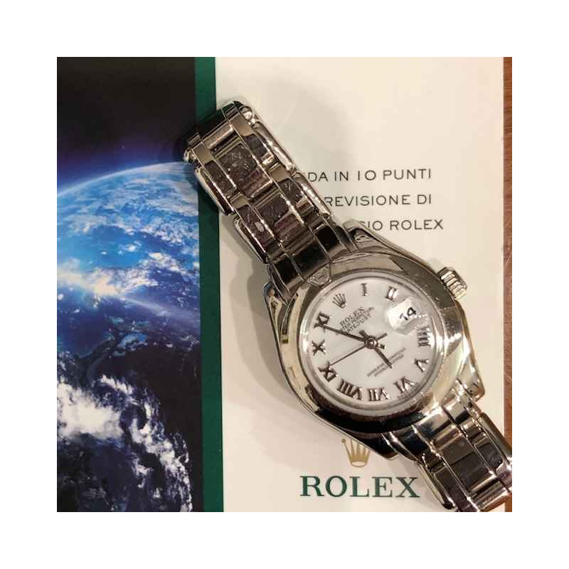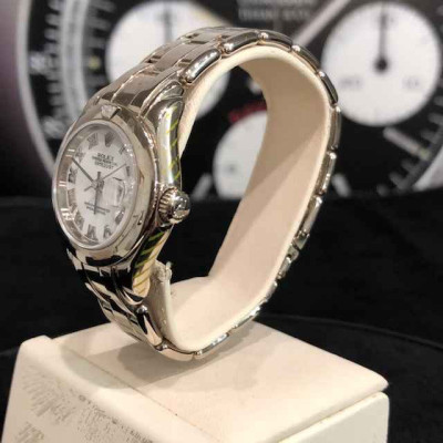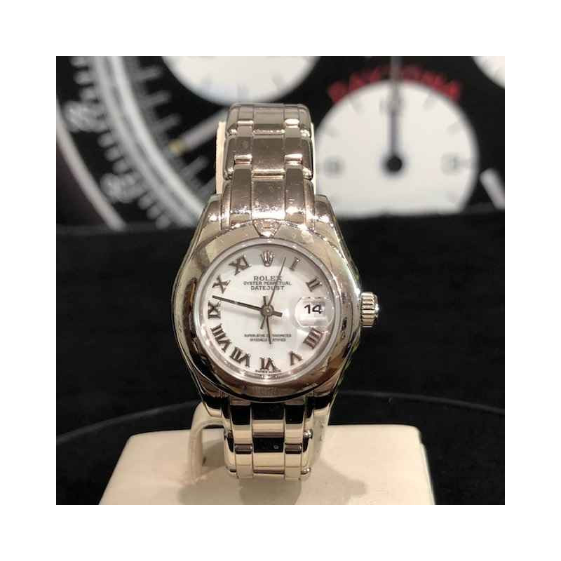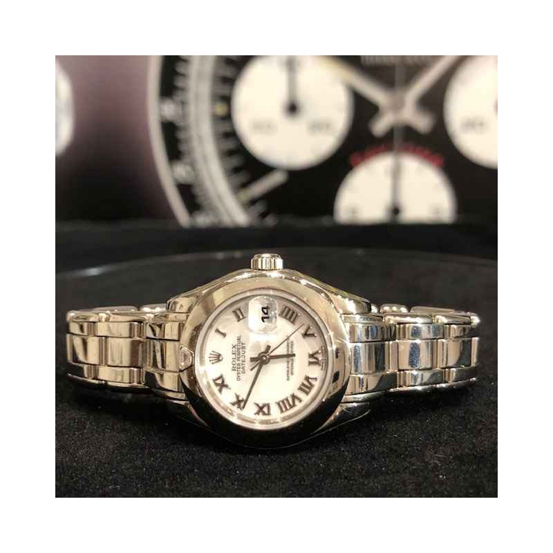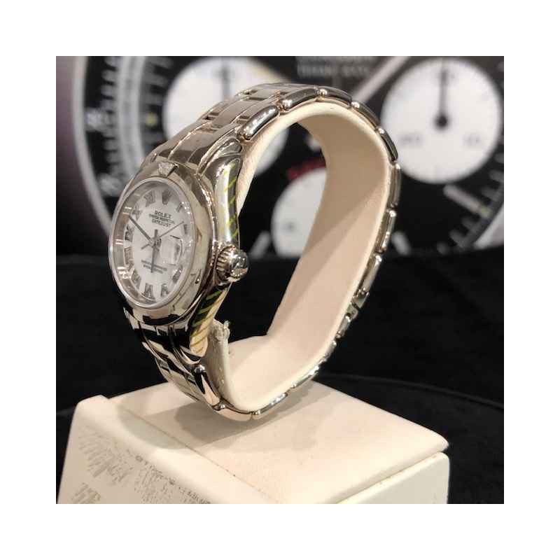 Laurenti Orologi propone un elegante e raffinato Rolex Pearlmaster Ref. 69329 meccanico a carica automatica calibro 2135, cassa in oro bianco da 29mm., vetro zaffiro, quadrante bianco con indici romani applicati, lunetta liscia in oro bianco con diamante a marcare le ore 12, bracciale pearlmaster in oro bianco, chiusura deployant.