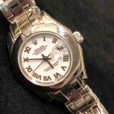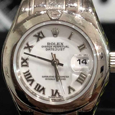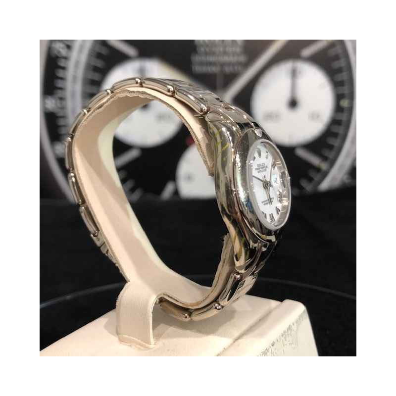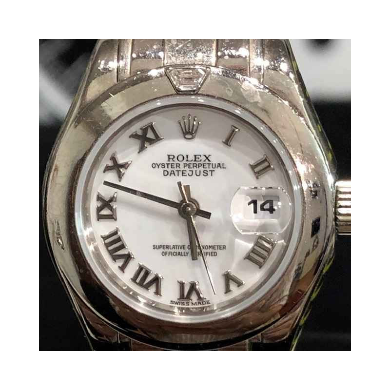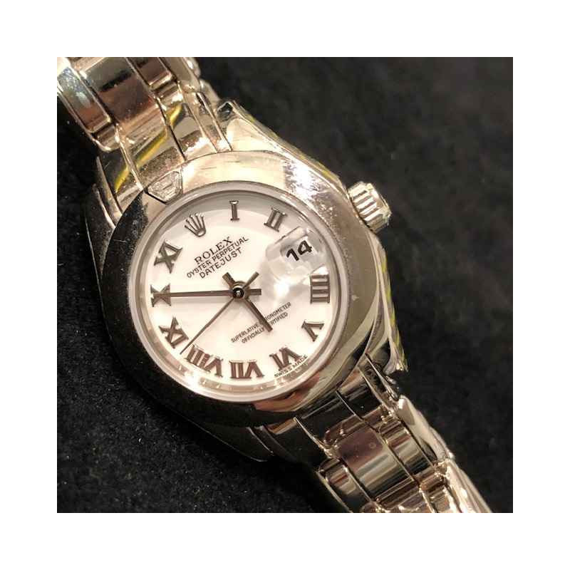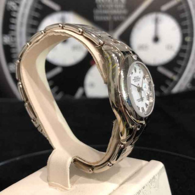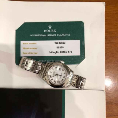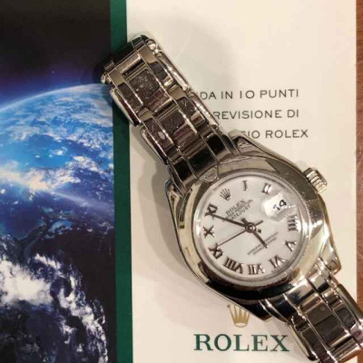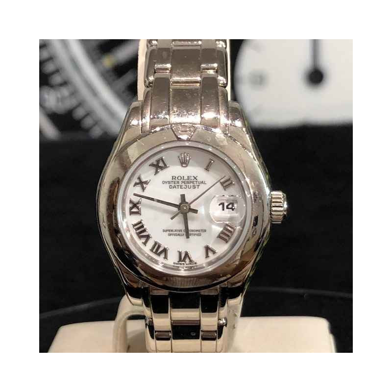 Laurenti Orologi propone un elegante e raffinato Rolex Pearlmaster Ref. 69329 meccanico a carica automatica calibro 2135, cassa in oro bianco da 29mm., vetro zaffiro, quadrante bianco con indici romani applicati, lunetta liscia in oro bianco con diamante a marcare le ore 12, bracciale pearlmaster in oro bianco, chiusura deployant.