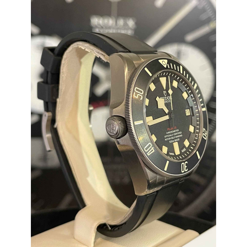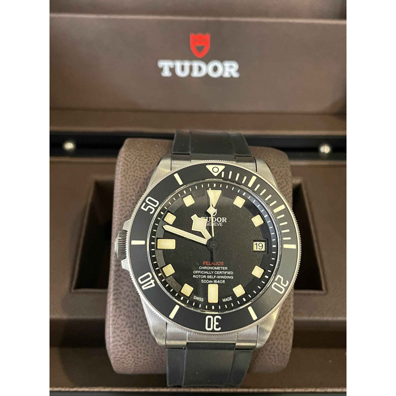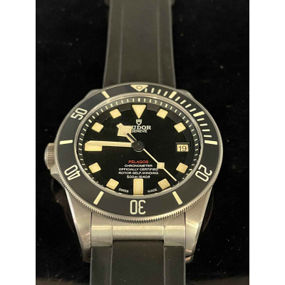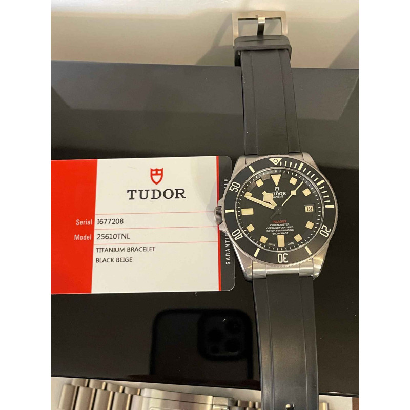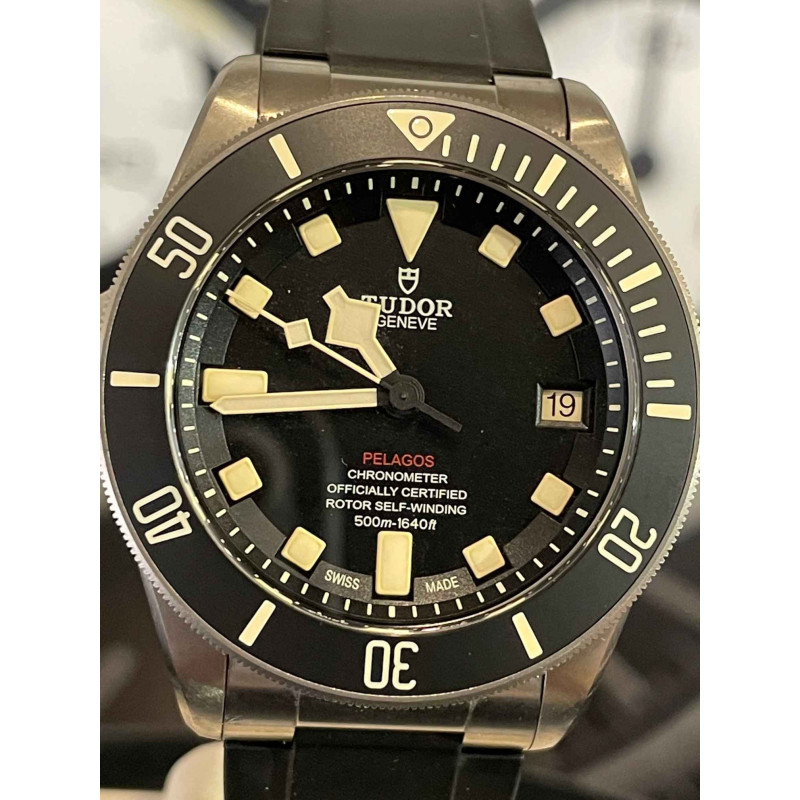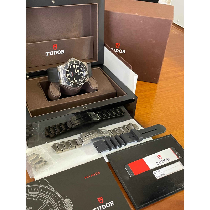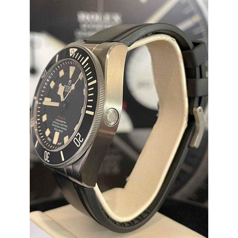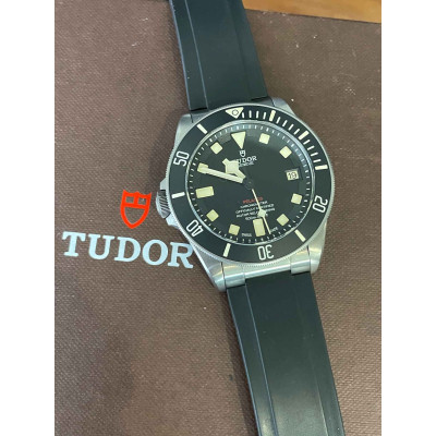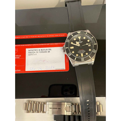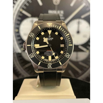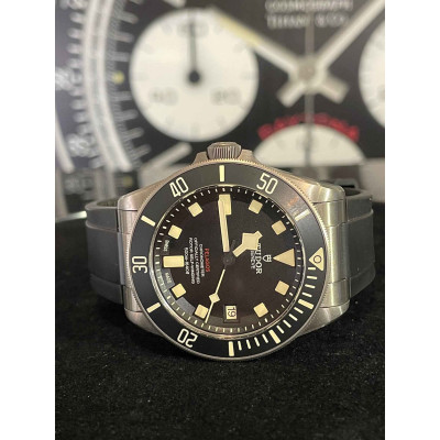 Laurenti Orologi propone un Tudor Pelagos LHD Ref M25610TNL, meccanico a carica automatica calibro MT5612-Lhd, cassa in titanio da 42 mm., corona di carica spostata ad ore 9, valvola per la fuoriuscita dell'elio ad ore 3. Vetro zaffiro, quadrante nero, ghiera girevole unidirezionale, con incisa scala graduata con 60 minuti, disco in ceramica nero opaca, cinturino in caucciù nero e chiusura con fibia ed ardiglione originale Tudor.