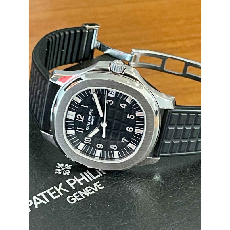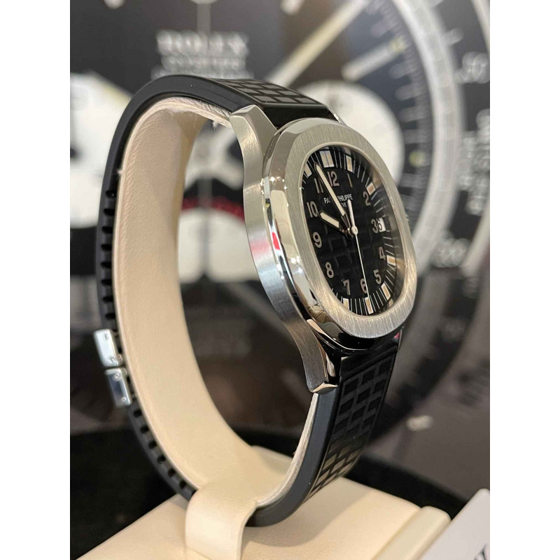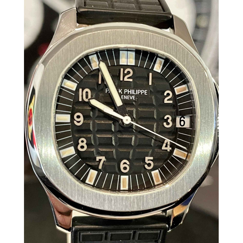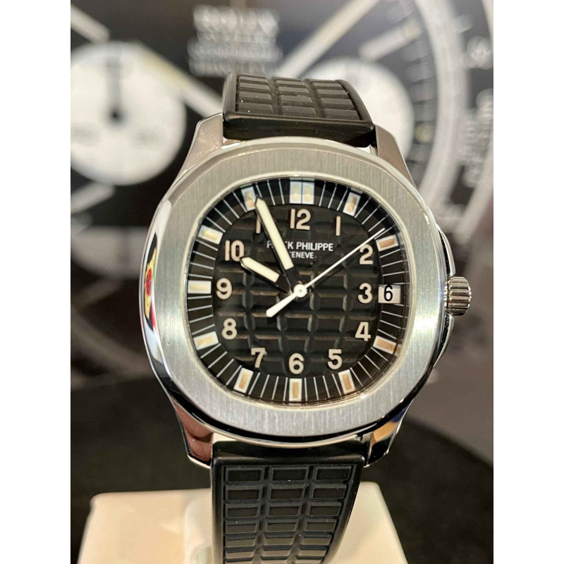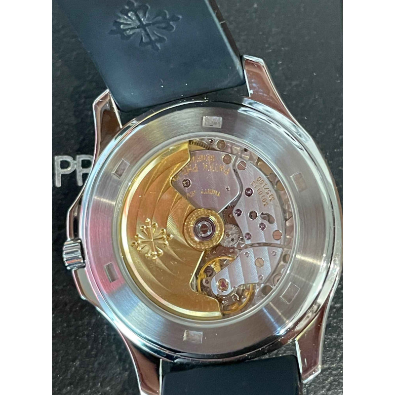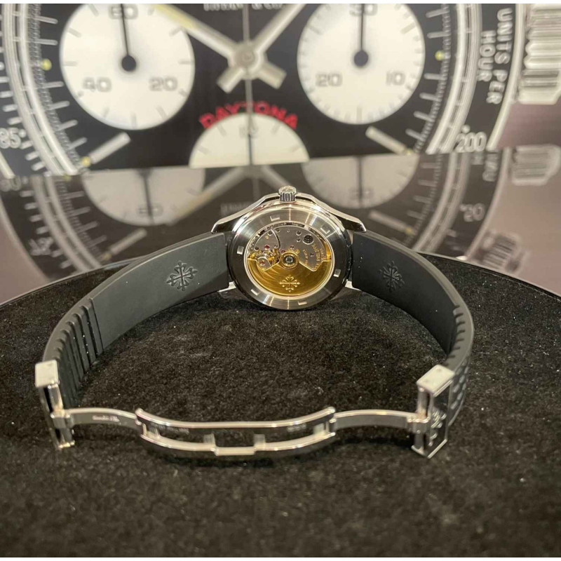 Laurenti Orologi propone un Patek Philippe, "Aquanaut Jumbo" Ref. 5065A, cassa in acciaio diametro 38 mm, movimento meccanico a carica automatica cal. 315SC. Quadrante nero " Tropilcal ", con decoro a rilievo, numeri arabi in oro applicati luminescenti al trizio, vetro zaffiro. Fondello avvitato in zaffiro, cinturino in caucciù nero "tropical", doppia chiusura deployante in acciaio con elemento di forma quadrata con logo inciso.