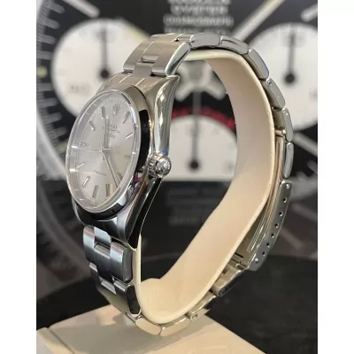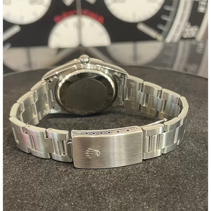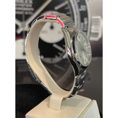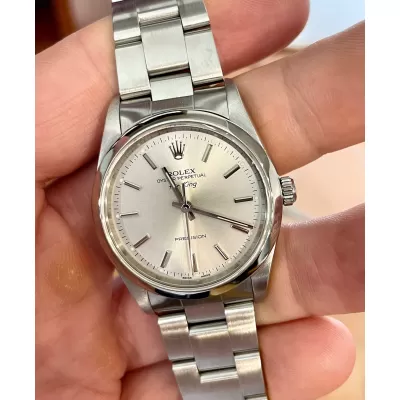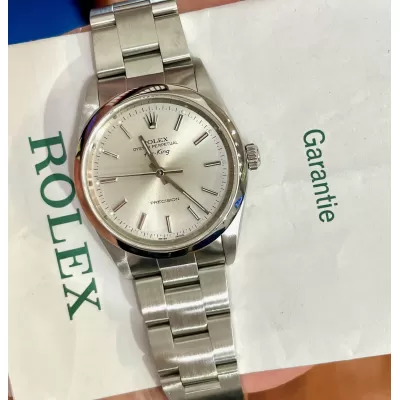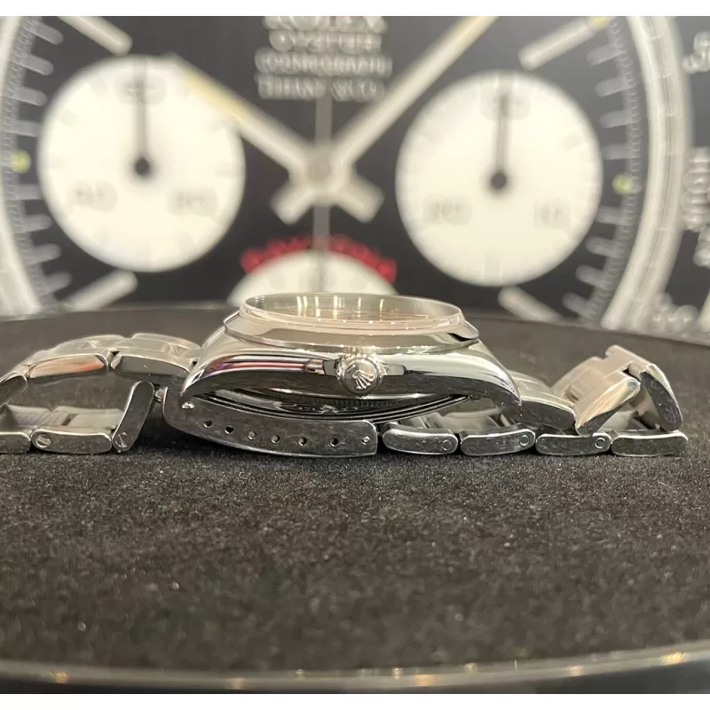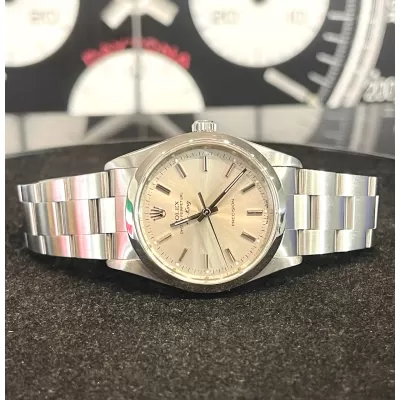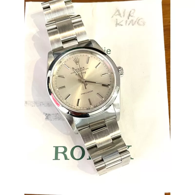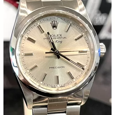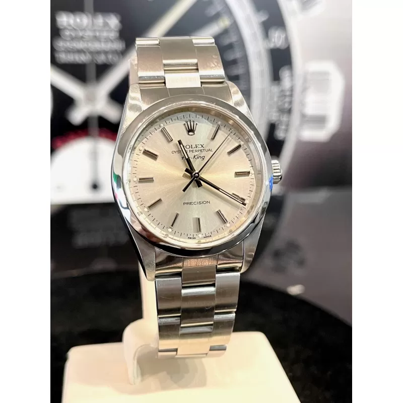 Laurenti Orologi propone un Rolex Air King Ref. 14000M meccanico a carica automatica calibro 3130. Cassa oyster in acciaio da 34 mm di diametro, vetro zaffiro, quadrante silver. Bracciale oyster in acciaio satinato con chiusura Rolex a cassettino in acciaio. Impermeabile 10 ATM.