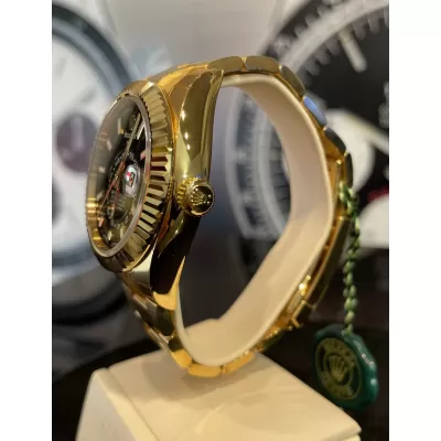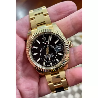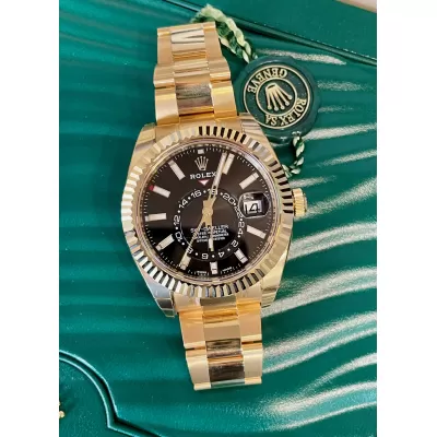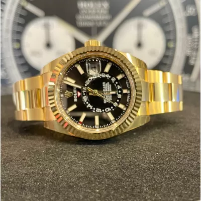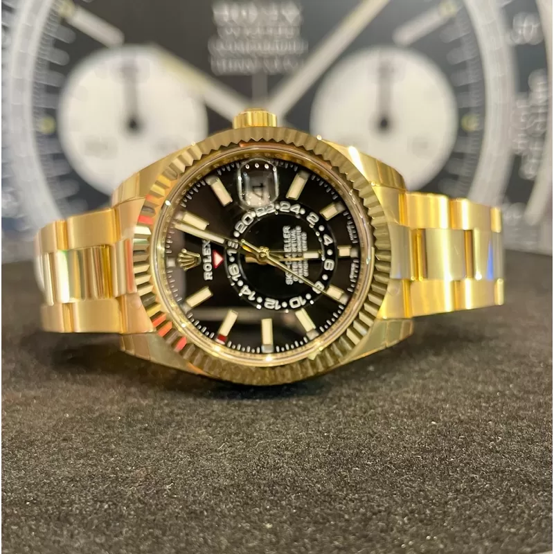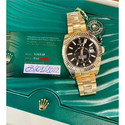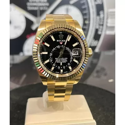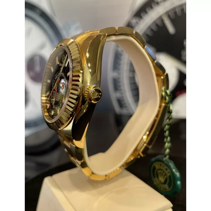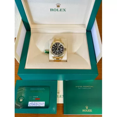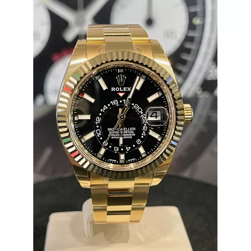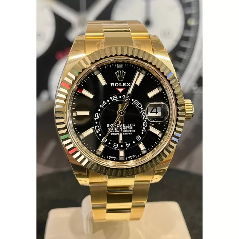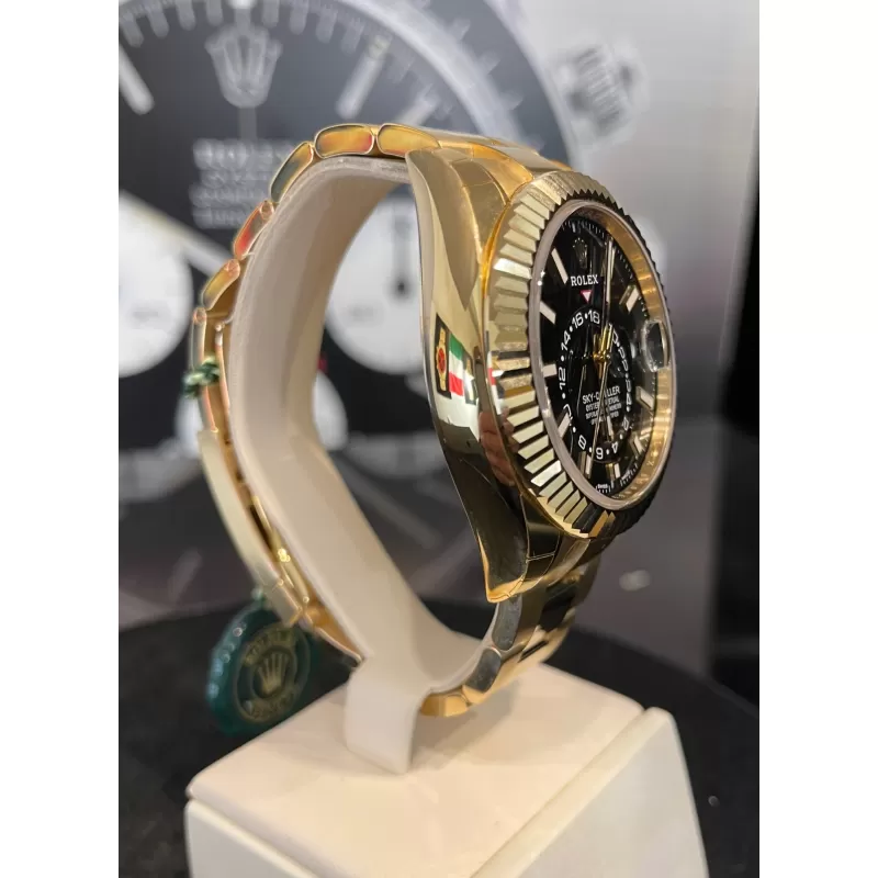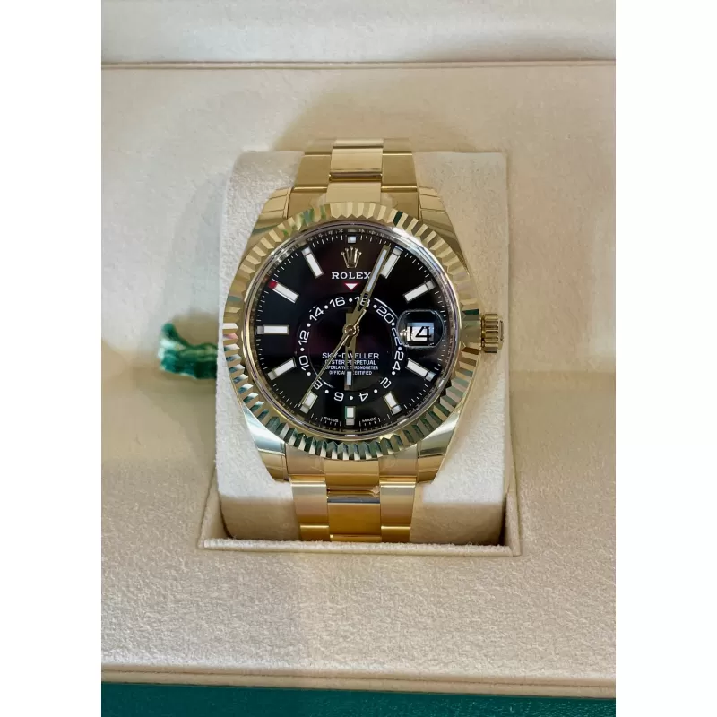 Laurenti Oorlogi propone un Rolex Sky Dweller Ref 326938, meccanico a carica automatica calibro 9001, cassa in oro giallo da 42mm., vetro zaffiro, quadrante nero con disco decentrato con visualizzazione delle 24 ore. Lunetta in oro giallo zigrinata, girevole bidirezionale Rolex Ring Command. Bracciale Oyster in oro giallo lucido satinato con fermaglio oysterclasp con chiusura pieghevole in oro giallo.