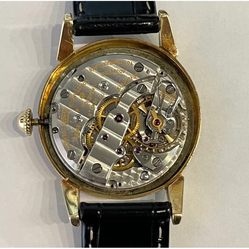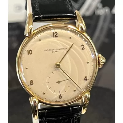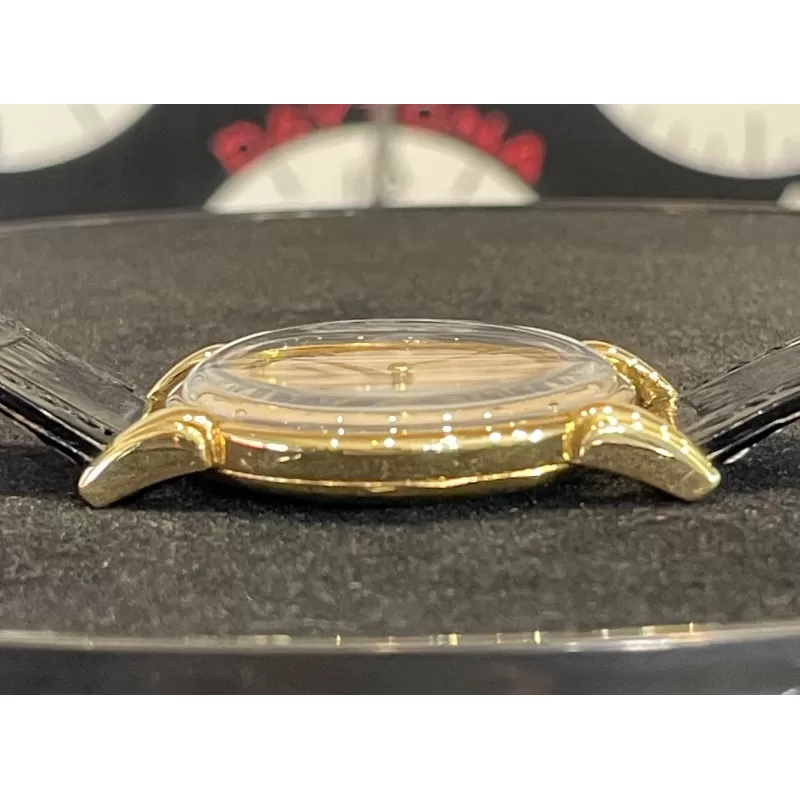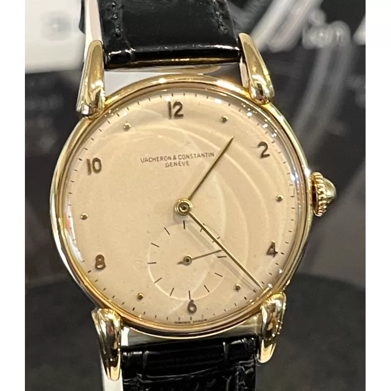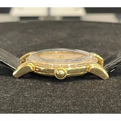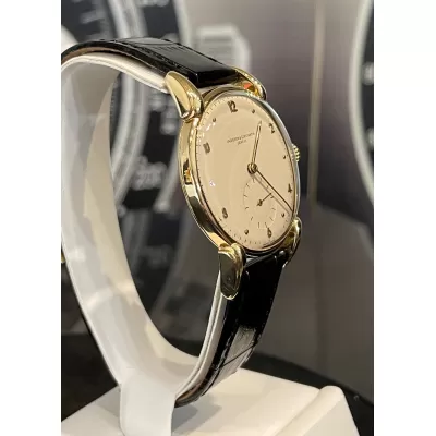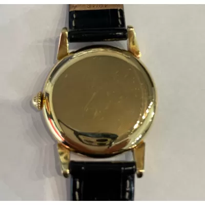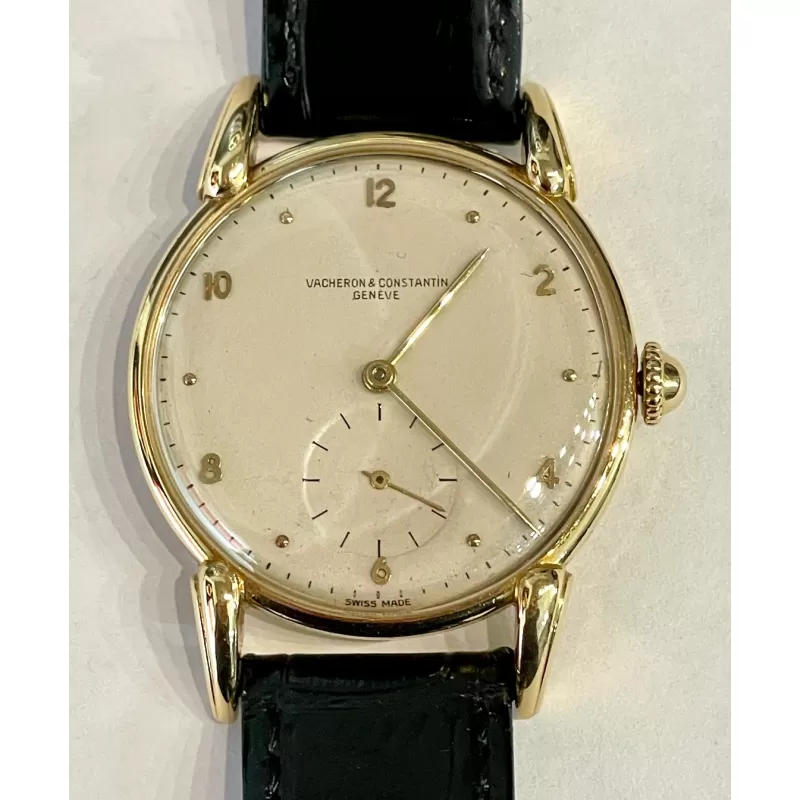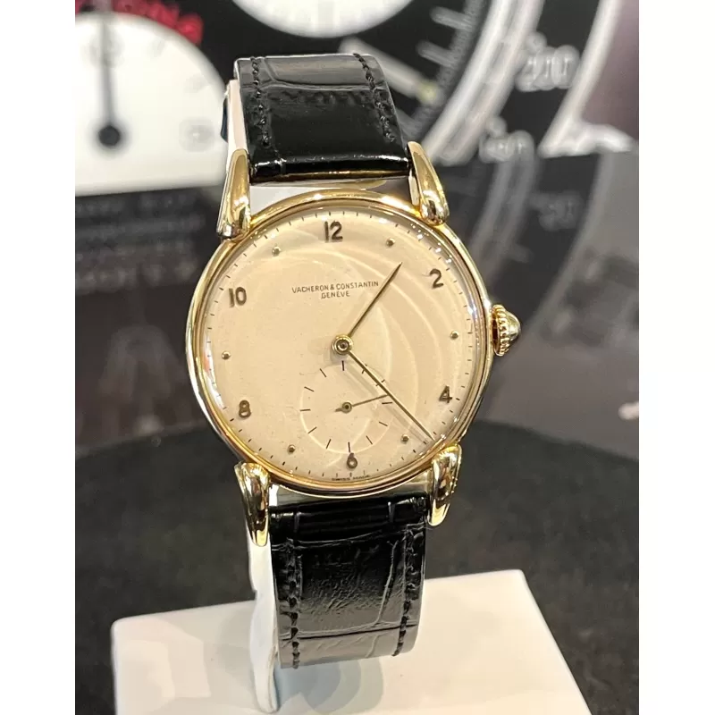 Laurenti orologi propone un Vacheron Constantin Rif 4126, cassa in oro giallo di forma rotonda da 35 mm., anse a ragno in oro giallo, movimento manuale calibro V453, quadrante bianco sporco, vetro plastica, corona di carica non originale, cinturino in pelle nero, fibbia ed ardiglione originale Vacheron in oro 18K.