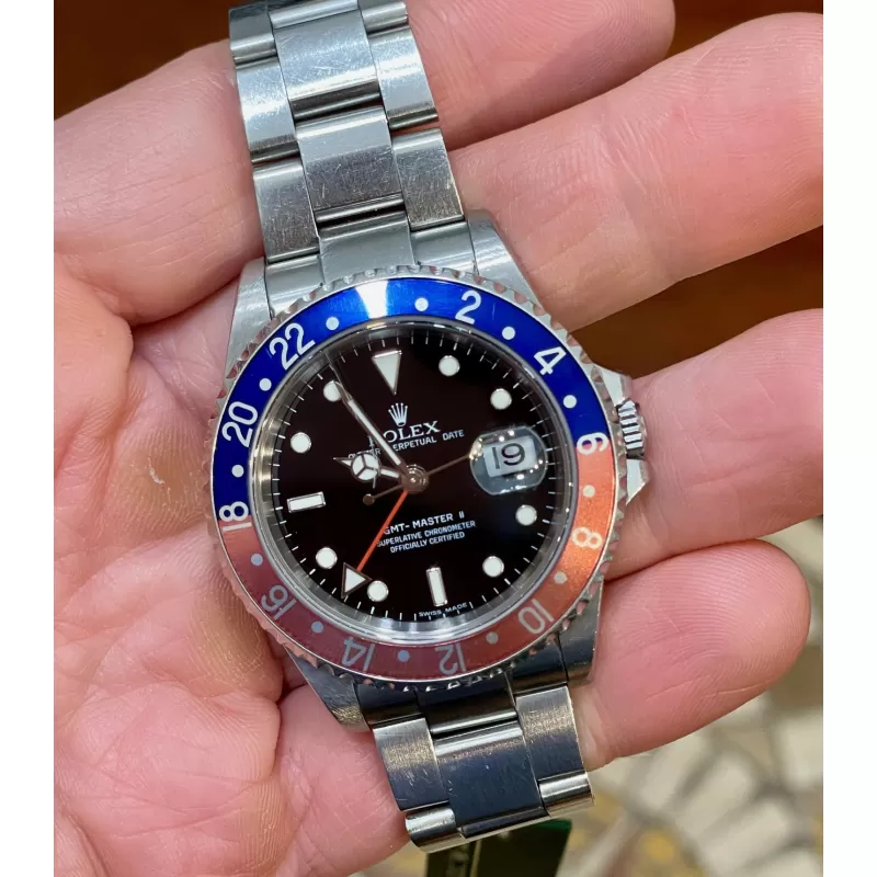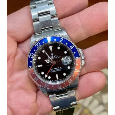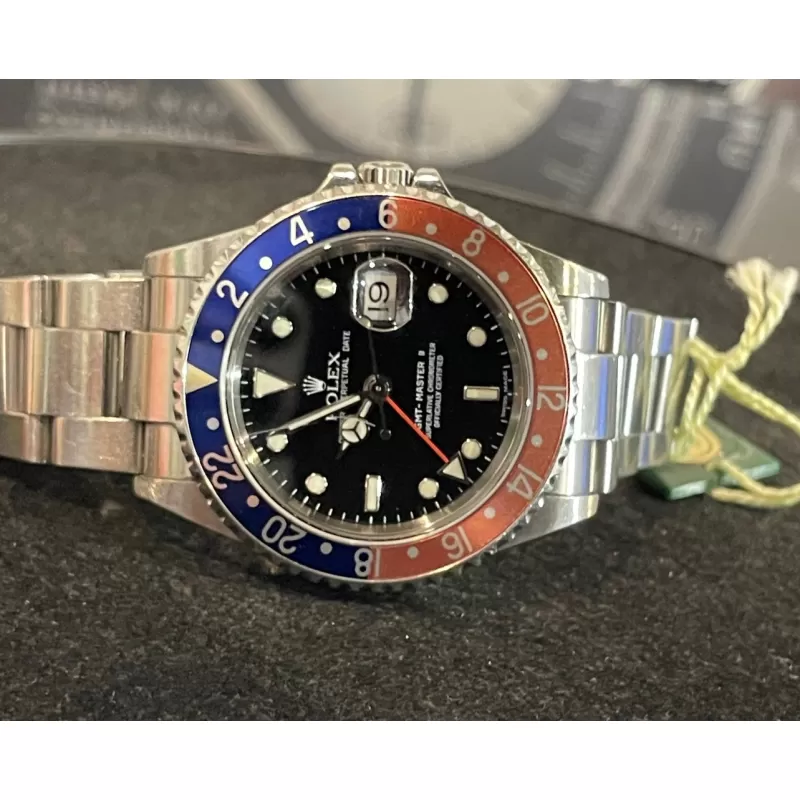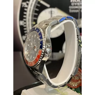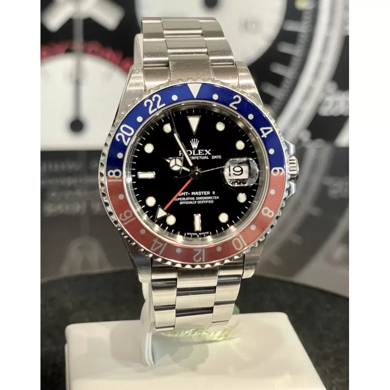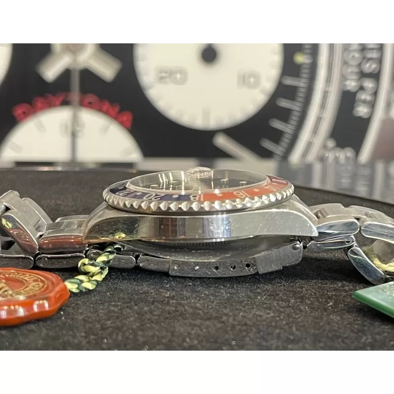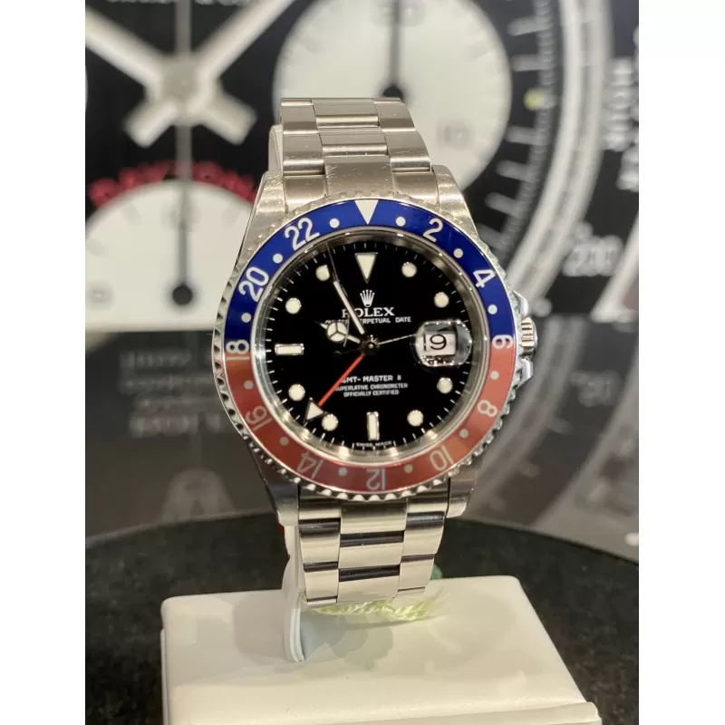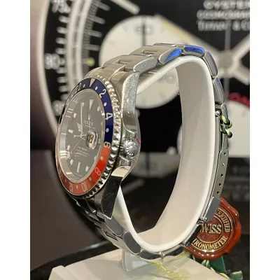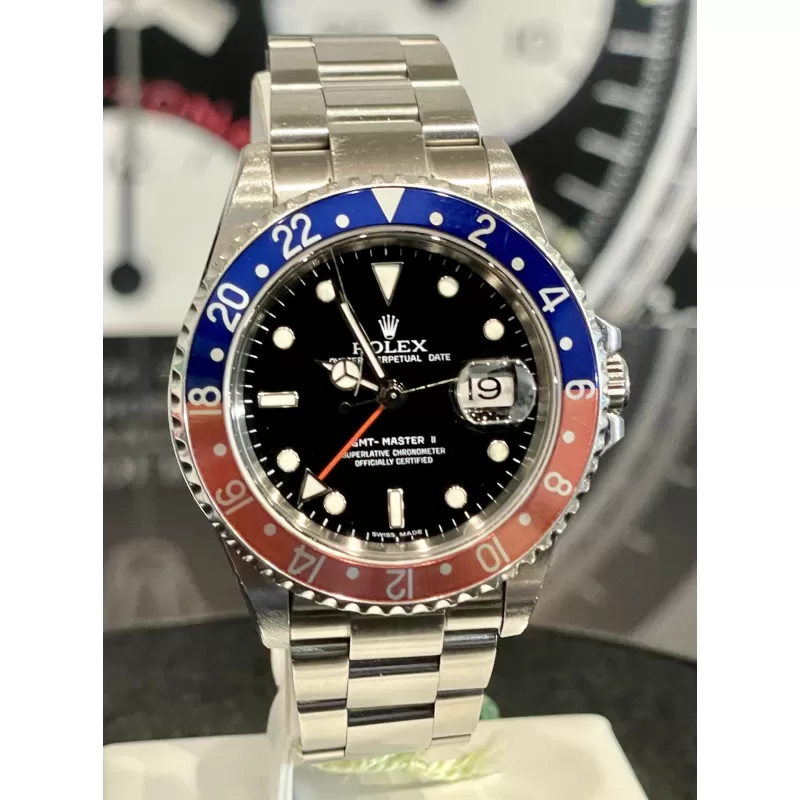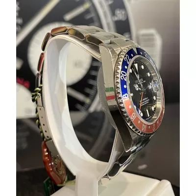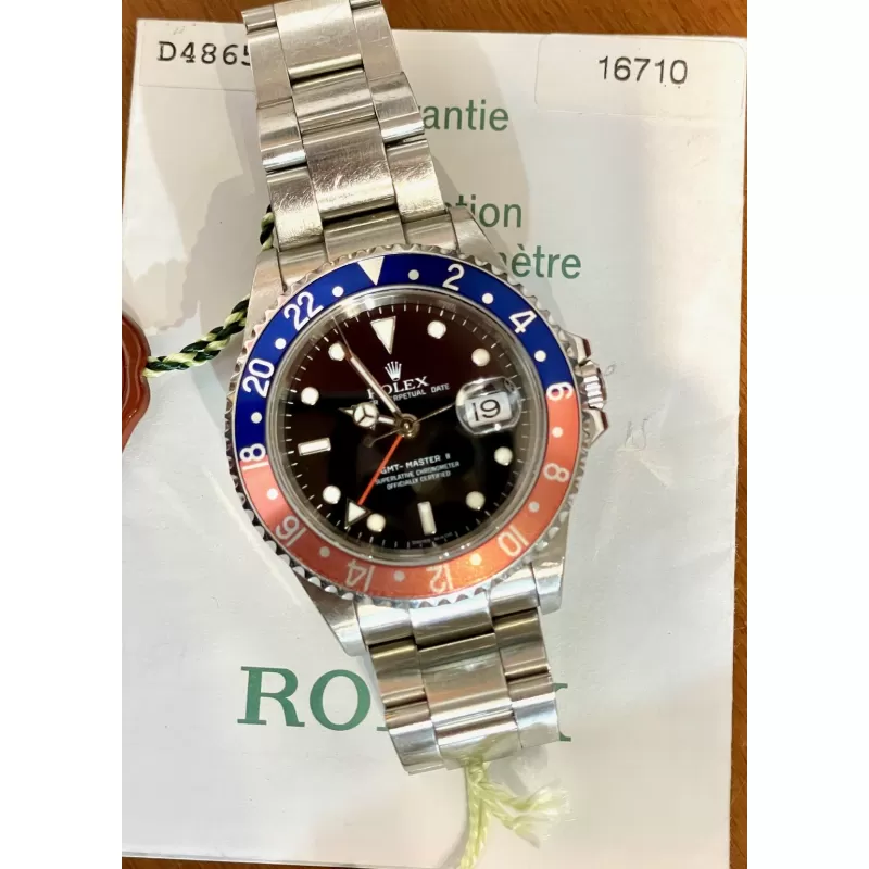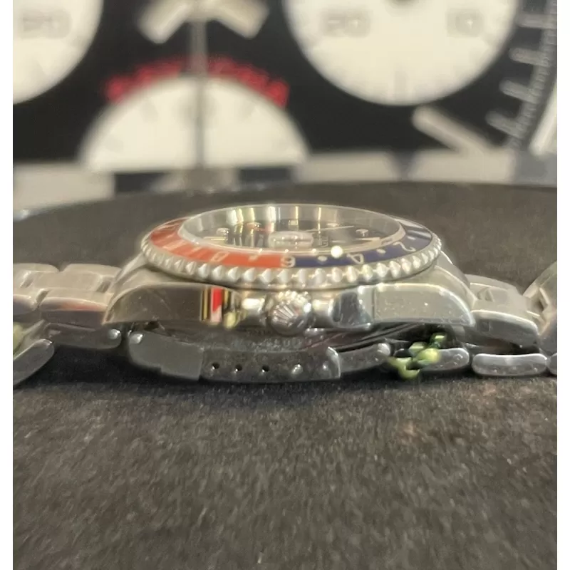 Laurenti Orologi propone un Rolex GMT Master II Ref 16710, meccanico a carica automatica, calibro 3185, cassa in acciaio da 40mm., vetro zaffiro, quadrante nero " STICK DIAL", ghiera con inserto blu e rosso denominata " PEPSI", bracciale oyster acciaio.