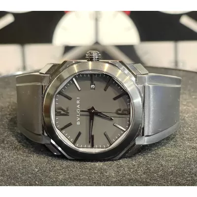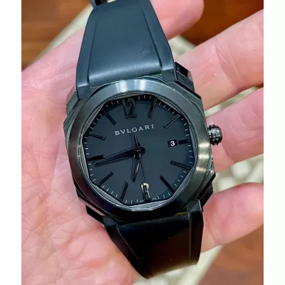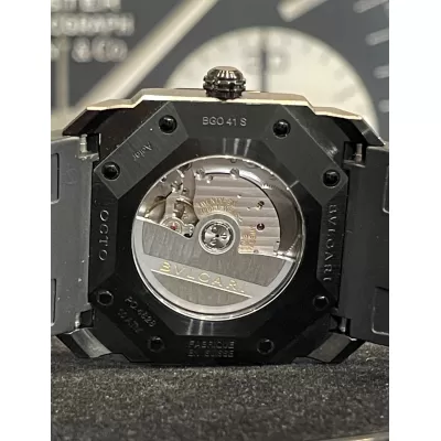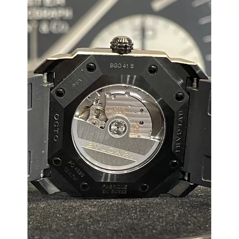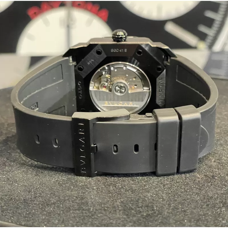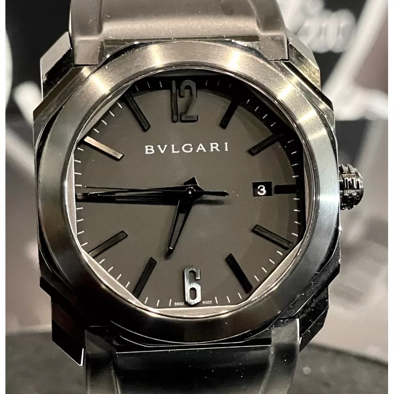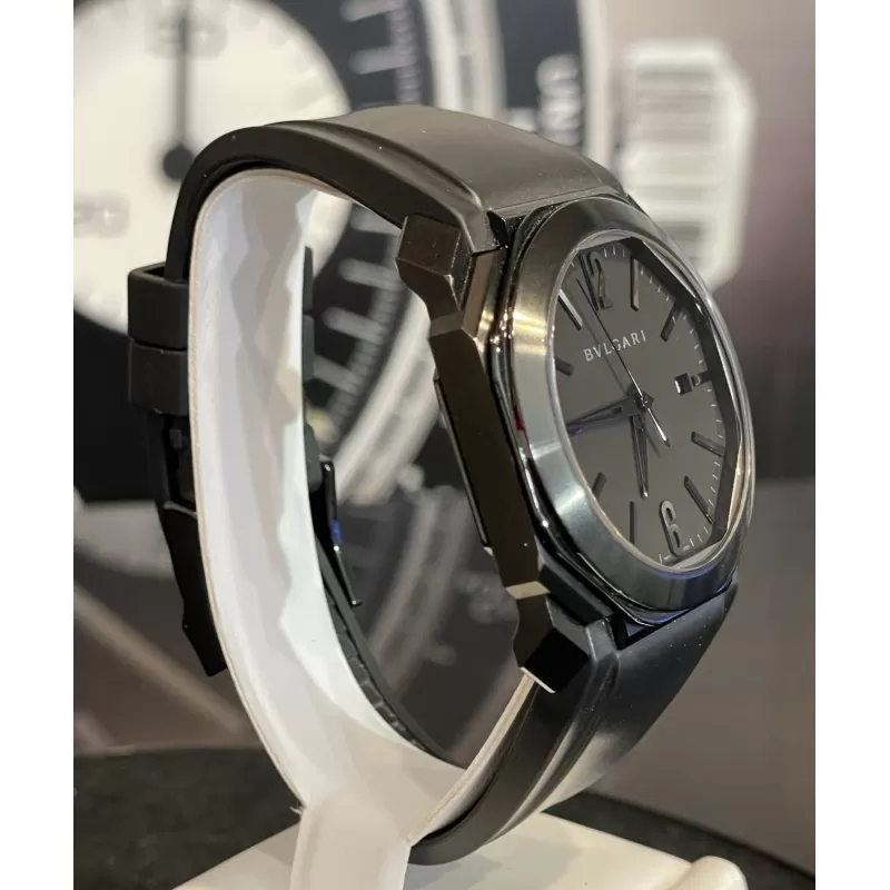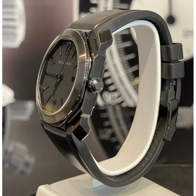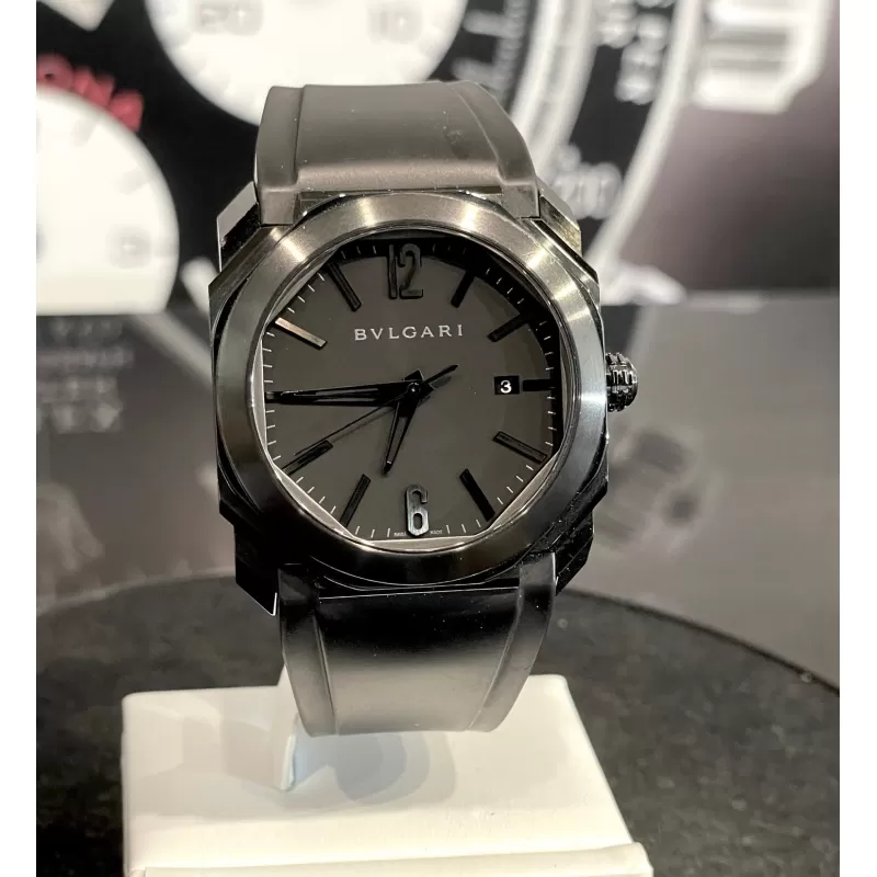 Laurenti Orologi propone un Bulgari Octo Ultranero, Ref. 102737 BGO41BBSVD/N carica automatica calibro Bulgari BVL191, cassa ottagonale da 41mm. in acciaio trattato in DLC, vetro zaffiro, quadrante nero con datario ad ore 3, cinturino in gomma nero, chiusura fibbia ed ardiglione in in acciaio DLC.